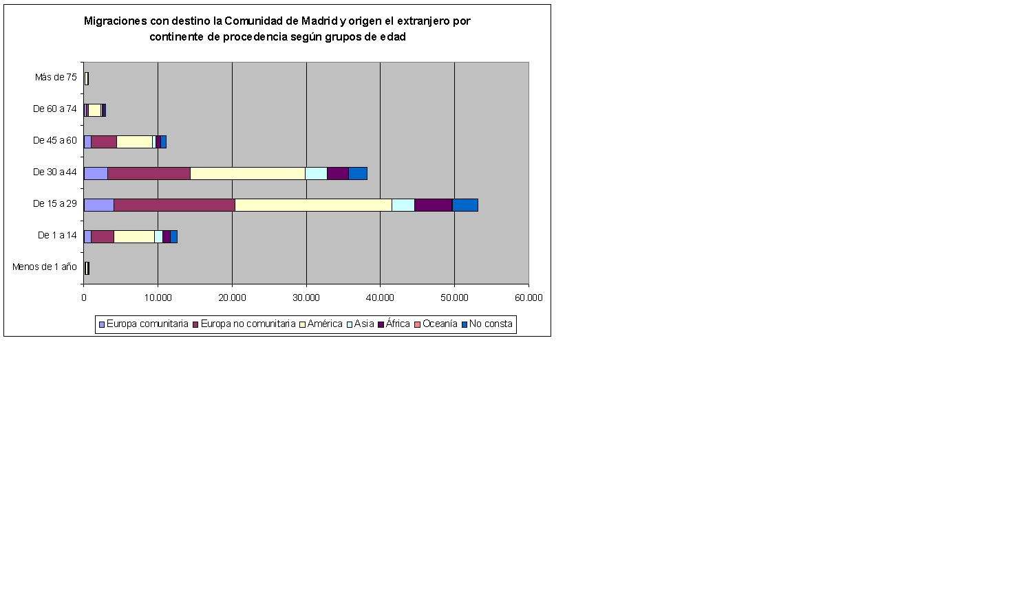 Migraciones con destino la Comunidad de Madrid y origen el extranjero por continente de procedencia según grupos de edad. 2004