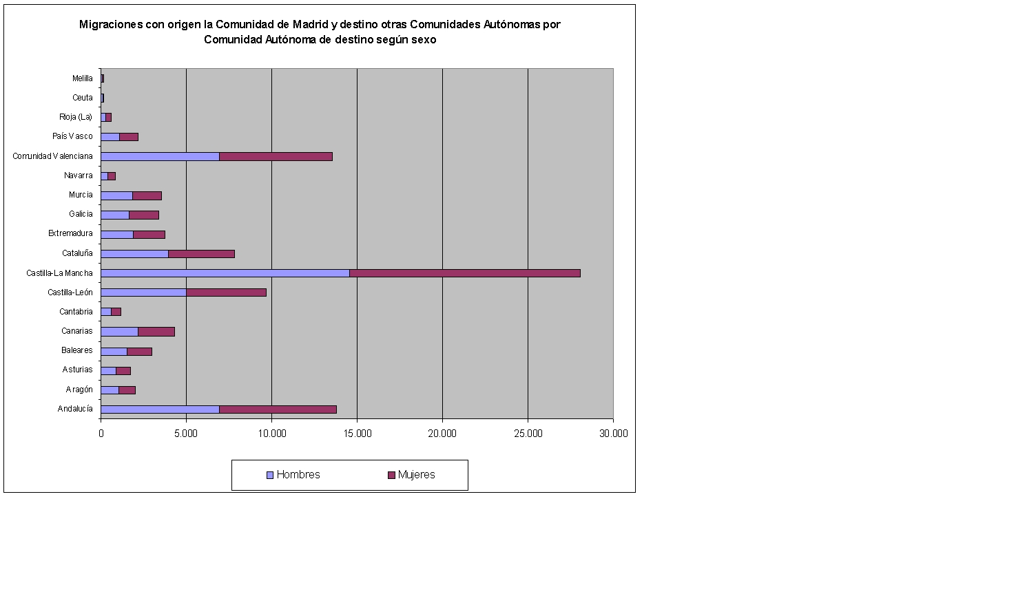 Migraciones con origen la Comunidad de Madrid y destino otras Comunidades Autónomas por Comunidad Autónoma de destino y sexo. 2004