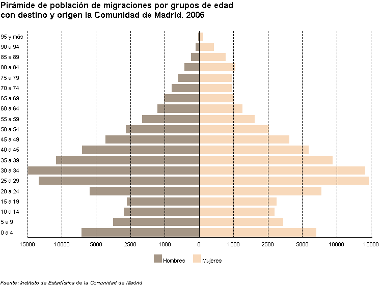 Pirámide de población de migraciones por grupos de edad con destino y origen la Comunidad de Madrid